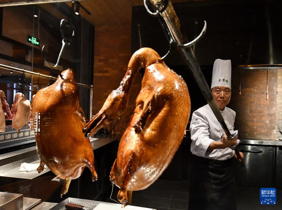 全聚德掛爐烤鴨第六代傳承人、高級(jí)烹飪技師吳玉波在出爐烤制好的掛爐烤鴨(3月13日攝)。