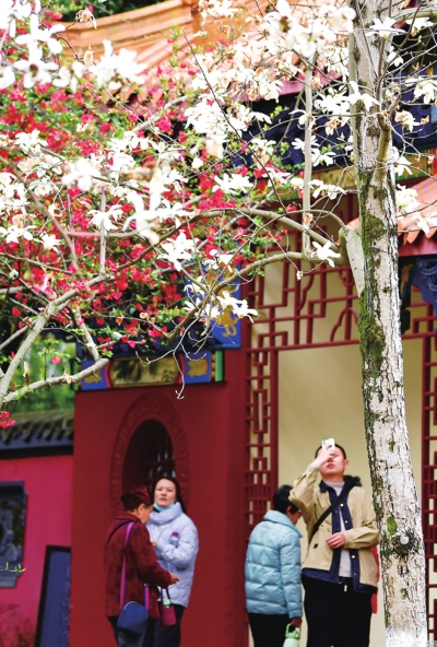 三月春濃,綿陽(yáng)城區(qū)西山公園的玉蘭花正值盛放期,吸引著許多市民和游客駐足觀賞拍照。