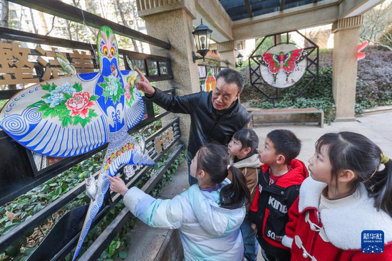 3月19日,中國風(fēng)箏協(xié)會理事金月強給孩子們介紹傳統(tǒng)風(fēng)箏的結(jié)構(gòu)和特點。