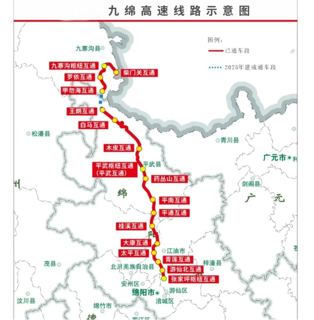 該項目2016年獲得工可報告批復、實現控制性工程——全長13公里白馬隧道先期開工,2018年全線開工建設。目前,起點川甘界至九寨溝縣甲勿海互通41公里、平武縣王朗互通至止點179公里已建成通車,結束了九寨溝縣、平武縣、北川縣不通高速公路的歷史;平武縣王朗互通到九寨溝甲勿?;ネ?4公里正在加快建設,預計今年三季度全線建成通車。