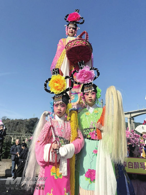 當(dāng)天正是江油市第十三屆鄉(xiāng)村文化旅游節(jié)啟動(dòng)儀式暨二郎廟鎮(zhèn)桃花節(jié)開幕的日子,聶建璋從清晨5時(shí)起床就開始忙碌,只為借桃花節(jié)的東風(fēng),把這傳承300年的民俗再次完美呈現(xiàn)于世人。“從討論劇目、畫劇目樣稿、設(shè)計(jì)動(dòng)作、制作道具、找村里合適的娃娃參演,再到上妝、綁扎、巡演,前后要忙一個(gè)多月。”聶建璋說。