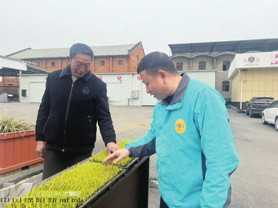 林江(左)查看剛剛從生產(chǎn)線下線的育秧盤