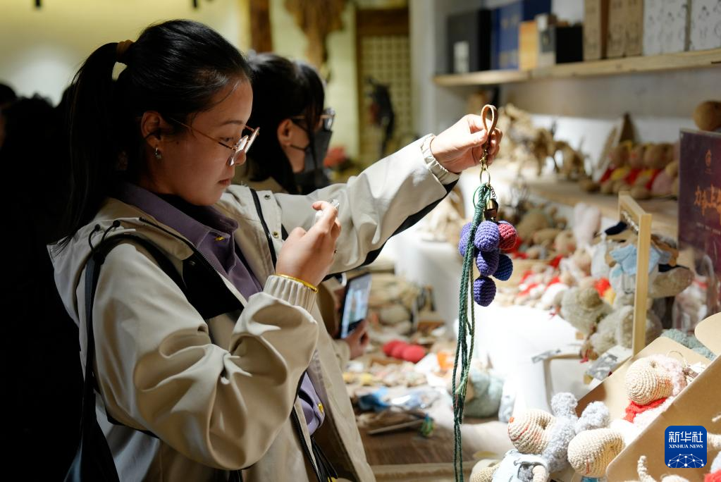 3月26日,參觀者在寧夏非遺麻編傳承基地選購文創(chuàng)產(chǎn)品。