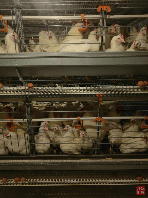在生產(chǎn)區(qū)的雞舍里,自動(dòng)化設(shè)備隨處可見,室內(nèi)通過自動(dòng)化環(huán)境控制系統(tǒng)可以調(diào)節(jié)溫度、濕度、通風(fēng)情況,自動(dòng)霧化消毒除塵。種雞住著“上下鋪”,吃著定時(shí)定量投喂的過濾凈化水和定制配方飼料,糞便由糞帶收集定時(shí)處理,剛產(chǎn)下的新鮮蛋順著籠網(wǎng),自動(dòng)滾入蛋帶。