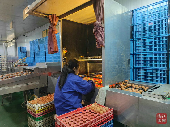4棟雞舍產(chǎn)出的新鮮種蛋被傳送運(yùn)輸至蛋庫(kù)的流水線。在這里,四五個(gè)工作人員與機(jī)器設(shè)備配合默契:肉眼初步挑選、光照二次篩選、機(jī)器稱重分揀……經(jīng)過標(biāo)準(zhǔn)流程,剔除不合格種蛋,合格種蛋則被打包送進(jìn)熏蒸室消毒。工作人員說,平均每天經(jīng)此流程處理的種蛋超過10萬枚。