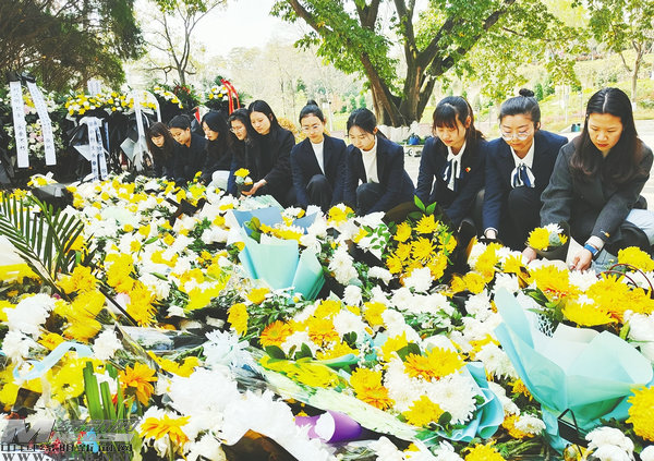 4月3日,在綿陽(yáng)市烈士陵園,機(jī)關(guān)幼兒園的老師們向烈士敬獻(xiàn)鮮花。
