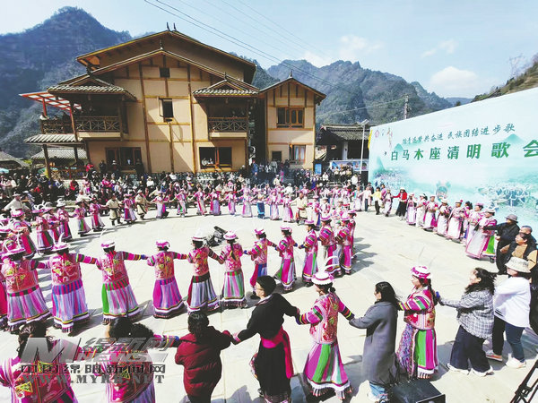同一天,在平武木座藏族鄉(xiāng),白馬清明歌會點燃古老村寨的春日激情。頭戴羽毛氈帽、腰系五彩織帶的藏族姑娘小伙,手挽手跳起“曹蓋舞”,皮鼓聲在山谷久久回響,游客被熱情拉進隊伍,腳步雖凌亂卻笑容滿面。75歲的非遺傳承人尼瑪措,坐在火塘邊教游客用羊毛線繡羊角花。