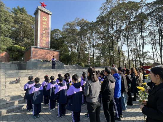 黨員教師的手勢劃破春風,誓言如松,在紀念碑前扎根。那些從光榮革命歷史閃爍而來的星火,此刻正在鏗鏘有力的誓言里拔節(jié)生長。