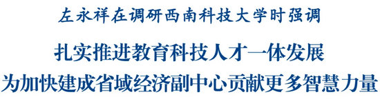 調(diào)研過程中,左永祥指出,當(dāng)前綿陽正加快建成省域經(jīng)濟(jì)副中心,更加需要優(yōu)質(zhì)高等教育支撐發(fā)展,需要科學(xué)知識和優(yōu)秀人才服務(wù)發(fā)展。西南科技大學(xué)要全面落實(shí)黨的教育方針,大力推進(jìn)學(xué)校建設(shè)和改革,抓好日常安全管理,進(jìn)一步把優(yōu)勢做優(yōu)特色做特,積極爭創(chuàng)國家“雙一流”學(xué)科建設(shè),加快推動學(xué)校內(nèi)涵式高質(zhì)量發(fā)展。要堅(jiān)持教育、科技、人才一體化發(fā)展理念,持續(xù)優(yōu)化專業(yè)設(shè)置,以人才培養(yǎng)需求、科技創(chuàng)新需求為牽引,著力構(gòu)建一流學(xué)科專業(yè)生態(tài)體系,努力培養(yǎng)更多適應(yīng)和引領(lǐng)現(xiàn)代化建設(shè)的創(chuàng)新型、應(yīng)用型、復(fù)合型優(yōu)秀人才。要深度融入地方發(fā)展大局,充分發(fā)揮科研和人才優(yōu)勢,聚焦綿陽重點(diǎn)產(chǎn)業(yè)鏈建設(shè),深化產(chǎn)學(xué)研協(xié)同創(chuàng)新,加強(qiáng)校地、校企合作,推動更多科技成果轉(zhuǎn)化為現(xiàn)實(shí)生產(chǎn)力,為綿陽高質(zhì)量發(fā)展注入新動能。綿陽將全力支持西南科技大學(xué)發(fā)展,為學(xué)校創(chuàng)造更加優(yōu)質(zhì)的環(huán)境。