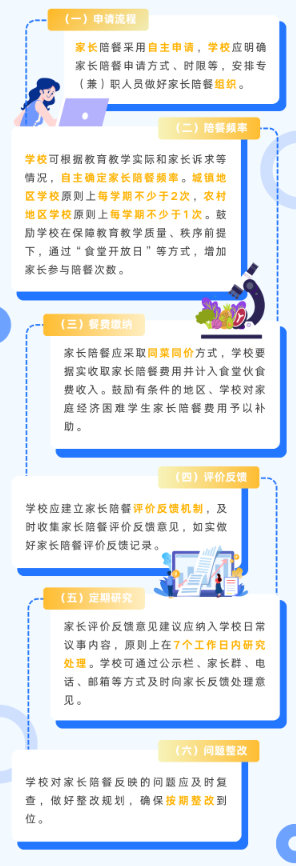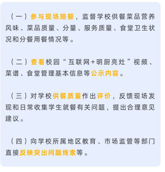 《指引》明確,各地教育主管部門負責指導本轄區(qū)學校有序推行家長陪餐工作,并將家長陪餐實施情況納入校園食品安全和膳食經(jīng)費管理工作日常監(jiān)管內(nèi)容,暢通家長陪餐問題反映直達渠道。各地教育主管部門要定期收集本轄區(qū)學校家長陪餐評價反饋意見,研判分析轄區(qū)內(nèi)家長反映的突出問題和合理建議,指導學校優(yōu)化供餐管理、提升菜品質(zhì)量。