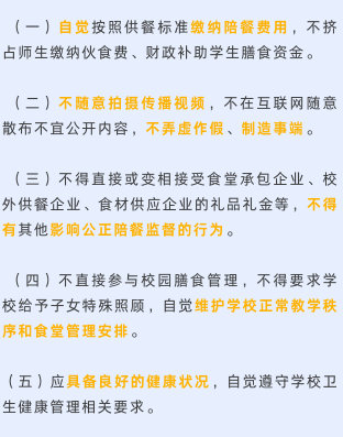 家長參與陪餐應(yīng)當遵守學校有關(guān)紀律要求,確保實事求是、客觀公正,并履行如下義務(wù):