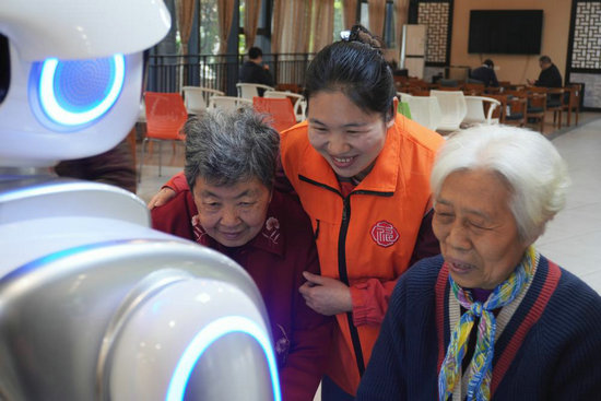 位于重慶巴南的重慶市第一社會福利院內(nèi),工作人員在詢問王奶奶(中)對于機(jī)器人的使用感受。張婭 攝