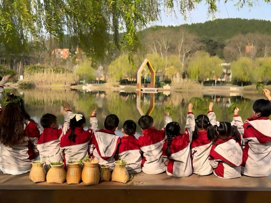 孩子們在老師的帶領下,親手插柳枝、編柳環(huán),戴在頭上嬉戲追逐。“柳樹是春天的使者,插柳代表我們對健康平安的愿望。”