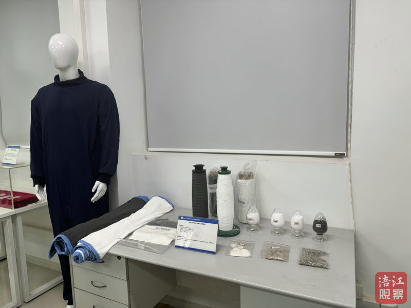 “我們突破了在高分子材料中輻射防護功能組元高填充的關鍵技術。”周元林教授指著成品介紹,從而形成的高填充纖維具有較好可紡性,制備出防輻射和穿戴舒適的纖維織物及其可穿戴制品。這也是目前國內首套具有輻射防護功能,又具備透氣透濕性的特種功能輻射防護服。