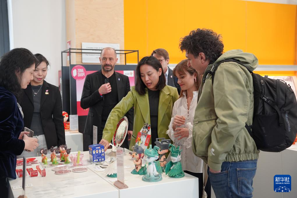4月7日,設(shè)計師在意大利米蘭設(shè)計周中國周的文創(chuàng)中國精品展區(qū)為游客介紹設(shè)計理念。新華社發(fā)(米蘭設(shè)計周中國周主辦方供圖)