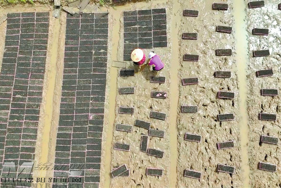 另一邊,經(jīng)過催芽后的一盤盤秧苗盤抵達位于黎雅鎮(zhèn)蘭花村的試驗田,村民將標(biāo)準(zhǔn)化的秧苗盤放置在水田里,等著出3片葉子后,差不多半個月時間,就可以拿出來用插秧機插秧了。