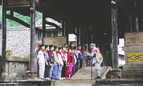 在紅軍橋上,聶學(xué)永給孩子們講紅軍故事