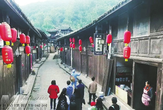 聶學(xué)永帶領(lǐng)游客走在古色古香的街道上,講解青林口的紅色故事