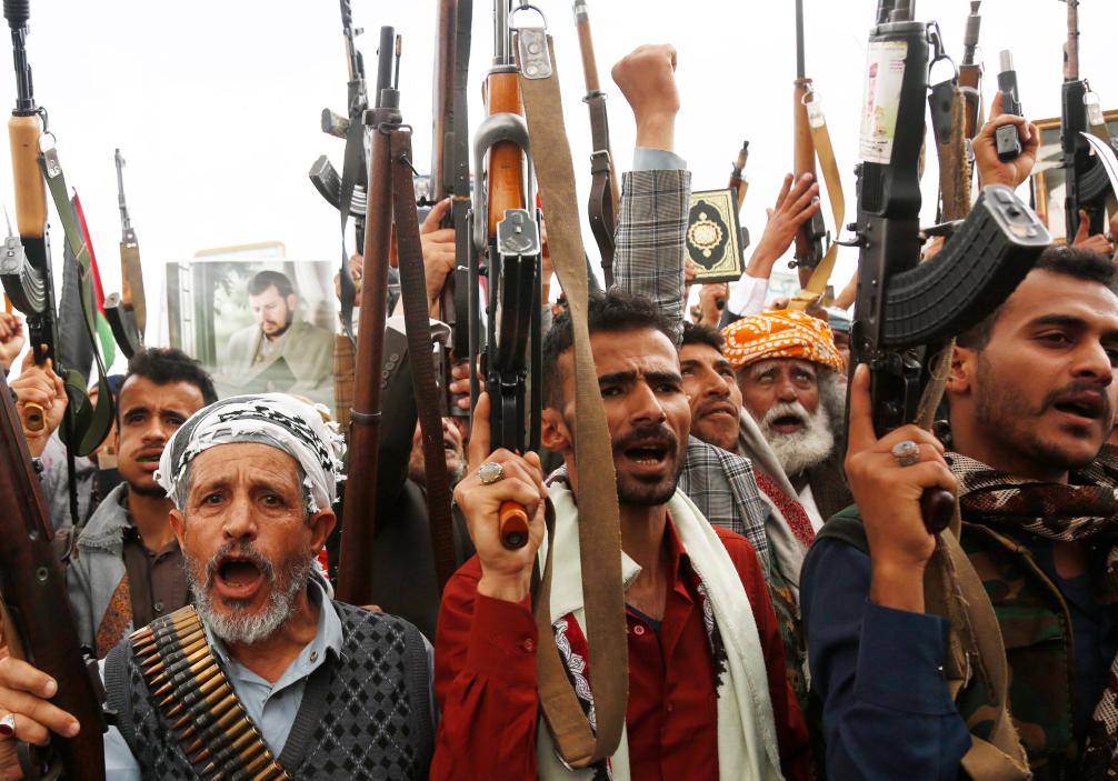 4月11日,數(shù)萬(wàn)民眾在也門(mén)首都薩那參加游行集會(huì),抗議美軍對(duì)也門(mén)的空襲。新華社發(fā)(穆罕默德·穆罕默德攝)