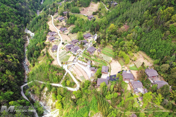 羌寨民居依山而建,次第鋪展,周圍山林碧波翻涌。