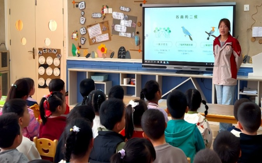 “雨生百谷,萍始生,鳴鳩拂羽……”稚嫩的童聲應(yīng)和著輕快的節(jié)拍,孩子們在《谷雨謠》手勢舞中化身“節(jié)氣小使者”,感受“時雨乃降,五谷百果乃登”的自然哲思。