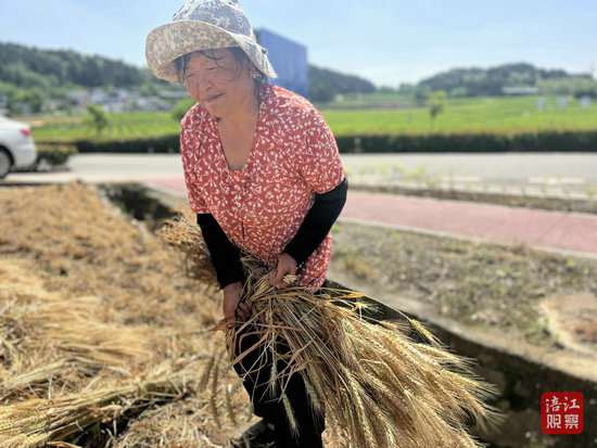 農(nóng)戶沈清林在運(yùn)糧車旁,興奮地捧起一把麥粒向記者展示:“你看,這麥子長(zhǎng)得多好,顆粒大而飽滿。之前還擔(dān)心收成,現(xiàn)在看來,產(chǎn)量非??捎^!”沈清林有3畝多小麥地耕地,一大早就聯(lián)系了收割機(jī),不到兩個(gè)小時(shí),收割機(jī)就收割完小麥,“機(jī)器收割很快很方便,收完了,我們也好趁著這兩天天氣好,把麥子曬干。”