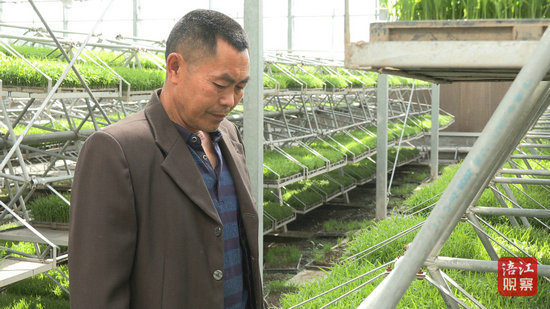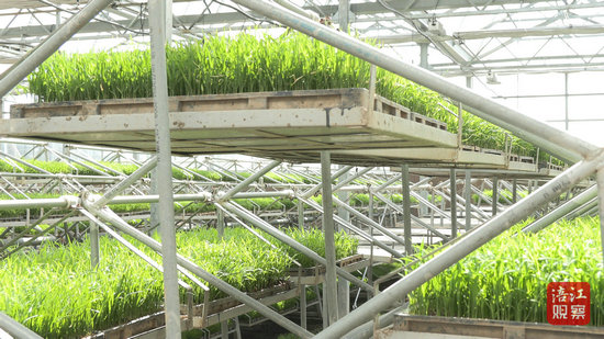 在合作社的育苗中心內(nèi),一個(gè)個(gè)已經(jīng)進(jìn)入育秧環(huán)節(jié)的秧盤在機(jī)器操控下勻速旋轉(zhuǎn)接受光照和噴灌,嫩綠的秧苗已經(jīng)有一指長(zhǎng)。