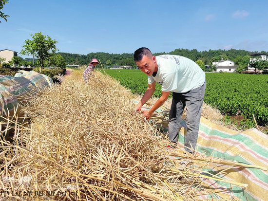 進(jìn)入5月,菜籽莢由綠變黃,發(fā)出沉甸甸的聲響,到了收割的最佳時機(jī)。5日上午,記者在涪城區(qū)楊家鎮(zhèn)萬和村看到,田間地頭男女老少齊心協(xié)力,手持鐮刀,彎腰割下一根根飽滿的油菜稈,并整齊地堆放在一起。隨著連枷有力地拍打菜籽稈,一顆顆飽滿的菜籽從莢中紛紛脫落,金黃的菜籽沐浴著陽光,閃爍著耀眼的光芒,等待著完全干燥。“還是種油菜好,油菜籽榨油,不光可以自家吃,還能賣出去。”萬和村村民陳建說。