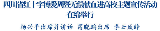 綿陽新聞網(wǎng)訊 5月7日,在第78個“世界紅十字日”來臨之際,由省紅十字會、省衛(wèi)生健康委、省教育廳、團(tuán)省委聯(lián)合主辦的四川省紅十字博愛周暨無償獻(xiàn)血進(jìn)高校主題宣傳活動在綿舉行。副省長、省紅十字會會長楊興平出席講話并看望慰問無償獻(xiàn)血師生,省政府副秘書長葛曉鵬出席,市委副書記、市長李云致辭。