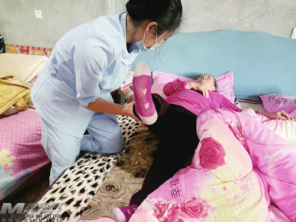 刁鑫從事臨床護(hù)理工作5年,去年冬天,她作為寶山村家庭醫(yī)生團(tuán)隊(duì)的一員,為轄區(qū)失能老人開展上門服務(wù)。寶山村12組李彩萍老人常年癱瘓?jiān)诖玻瑑号辉诩?,生活全由年邁的老伴打理。刁鑫和同事定期來到李彩萍老人家中,仔細(xì)地為老人擦拭身體、測(cè)量血壓、進(jìn)行身體檢查,還為老人打掃房間。一次,老人握著刁鑫的手,感激地說:“你們真是比我的親人還要親?。?rdquo;這句話,讓刁鑫深刻體會(huì)到護(hù)理工作的責(zé)任與使命,也更加堅(jiān)定了她從事護(hù)理行業(yè)的決心和救死扶傷的信念。