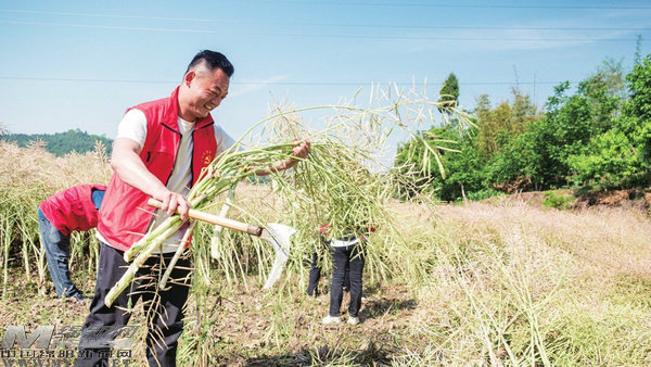 與此同時,在天生橋村的田野里,仙海區(qū)社發(fā)局的志愿者們同樣干得熱火朝天。他們俯身穿梭在金黃的“油菜海”中,鐮刀劃出一道道銀色弧線,成片的油菜稈應(yīng)聲倒地。
