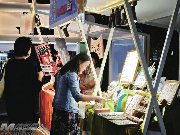 在凱德廣場,山海集夜市人頭攢動,玲瑯滿目的首飾在燈光映照下熠熠生輝。姑娘們圍在攤位前,手指輕輕撥弄著串珠、項(xiàng)鏈,愛不釋手。攤主一邊幫顧客試戴一邊熱情介紹貨品,此起彼伏的詢問聲里,夜市人氣滿滿。