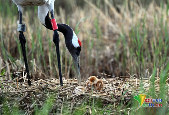 2025年5月14日,黑龍江扎龍國(guó)家級(jí)自然保護(hù)區(qū),丹頂鶴哺育幼鳥(niǎo)。自今年3月13日,黑龍江扎龍國(guó)家級(jí)自然保護(hù)區(qū)散養(yǎng)的丹頂鶴產(chǎn)下了今春的第一枚卵,保護(hù)區(qū)新一輪繁殖期在濕地上拉開(kāi)序幕。從1984年開(kāi)始,扎龍保護(hù)區(qū)實(shí)現(xiàn)丹頂鶴散養(yǎng)野外越冬,逐步建立散養(yǎng)鶴群體,經(jīng)過(guò)40多年的經(jīng)驗(yàn)積累逐步總結(jié)出了“親代放歸→中間種群(散養(yǎng)鶴種群)→子代野化”的野化方式,目前通過(guò)衛(wèi)星追蹤器(GPS)和環(huán)志佩戴方式成功監(jiān)測(cè)到遷徙數(shù)據(jù)25條,保護(hù)區(qū)繁育中心周邊穩(wěn)定的散養(yǎng)繁殖對(duì)維持在12——15對(duì)對(duì)左右。2025年截至目前,已觀察到15對(duì)散養(yǎng)丹頂鶴繁殖對(duì)筑巢產(chǎn)卵,孵化雛鳥(niǎo)24只,成活了14只左右。
