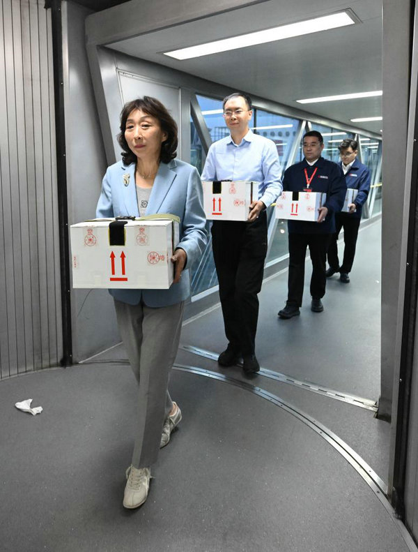 5月18日,護(hù)送文物歸國(guó)的工作人員手捧裝載著子彈庫(kù)帛書(shū)的保護(hù)箱走出客機(jī)。新華社記者 李賀 攝