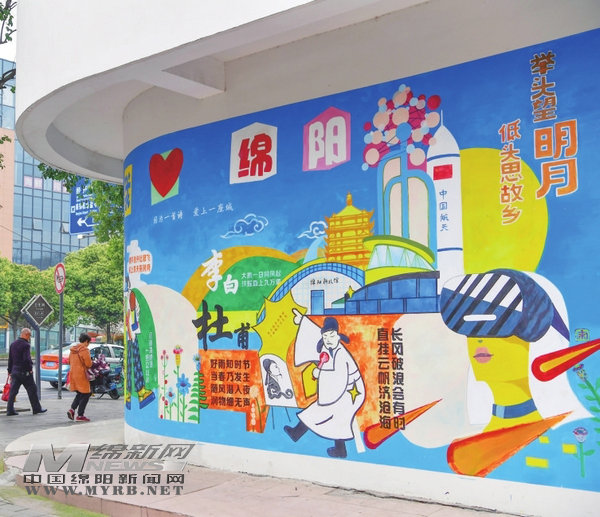 城市更新不是覆蓋過去,而是讓記憶開出新花。走進衛(wèi)生巷,涂鴉墻正上演一場穿越時空的對話:詩仙李白的詩句與北宋文豪歐陽修的典故躍然墻上,米粉豆?jié){油條的“老綿州記憶”與3D科幻之城、哪吒的熱血元素交相輝映,傳統(tǒng)與現(xiàn)代的碰撞中迸發(fā)出獨特的藝術魅力。正在拍照的市民小游笑著說:“綿陽街頭的藝術氣息越來越濃,既有文化底蘊又不失時尚感!”