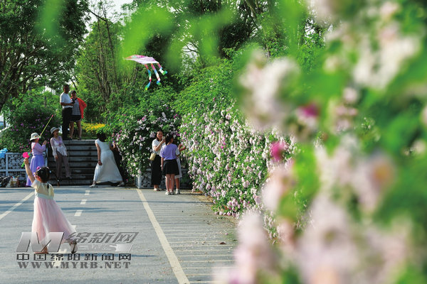 在九洲立交的匝道旁,三角梅如紅色瀑布般垂落,車輛穿行其間,仿佛駛入流動的畫卷;沈家壩芙蓉溪河堤路上,從李杜祠至白云洞方向的灰白墻體被爬山虎覆蓋,綠意與溪水相映成趣;高新區(qū)石橋鋪雙碑大橋兩側的花箱中,月季紅粉白交織,點綴在鋼鐵護欄間,隨風輕搖,香氣氤氳。這些立體綠化既實現(xiàn)物理隔離功能,又化身為城市的風景線。通過高架橋、河道堤岸等空間的垂直綠化,綿陽正努力用綠意編織更宜居的生活圖景。