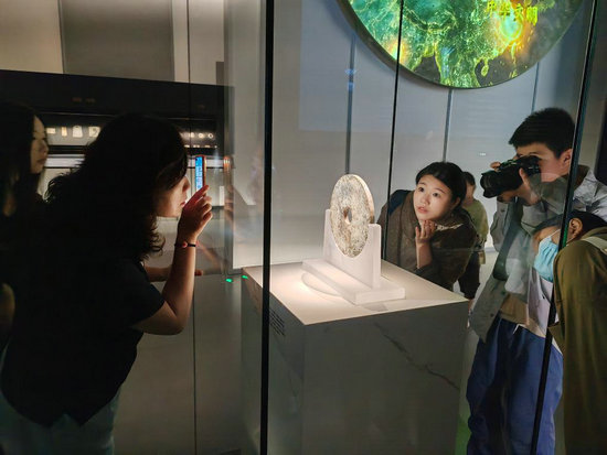 18日,觀眾在玉架山考古博物館玉架山遺址廳內(nèi)觀看良渚文化刻符玉璧。新華社記者 馮源 攝