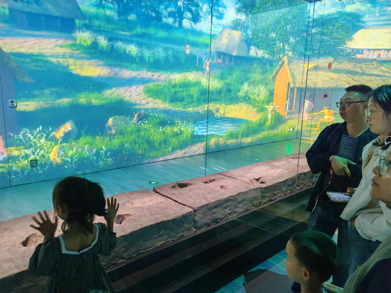 18日,觀眾在玉架山考古博物館茅山遺址廳內(nèi)觀看帶有牛蹄印的古稻田遺跡。新華社記者 馮源 攝