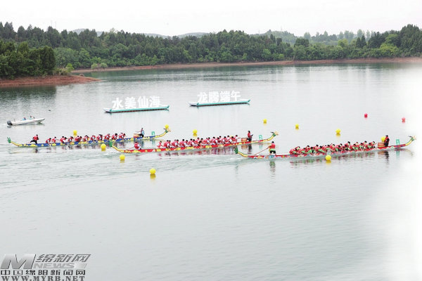 來自川渝兩地的龍舟隊伍在仙海湖面展開競速