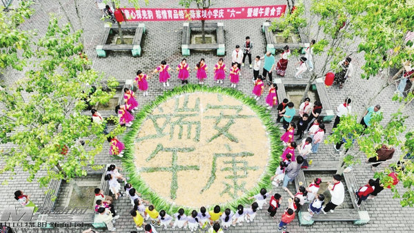 陳家壩小學師生用玉米和艾草拼出“端午安康”字樣