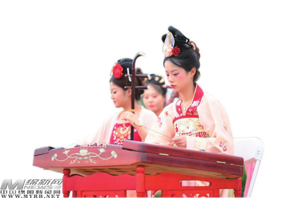 仙海風景區(qū)的漢服樂手演奏樂曲