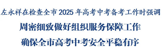 檢查中,左永祥強調(diào),高考中考牽動千家萬戶、事關(guān)萬千學(xué)子,是全社會高度關(guān)注的大事。各地各有關(guān)部門要進一步提高政治站位,全鏈條抓好考前考中考后各項工作,高標(biāo)準(zhǔn)嚴(yán)要求對各個環(huán)節(jié)進行再檢查、再完善,以扎實有力的工作成效讓考生舒心、家長安心、社會放心。要守牢安全底線,全面落實國家教育考試安全保密規(guī)定和考務(wù)管理要求,加強演練培訓(xùn)、強化技術(shù)賦能,精心做好考試組織、考試環(huán)境治理、考風(fēng)考紀(jì)建設(shè)等各項工作,全力防范失泄密、高科技舞弊等風(fēng)險。要強化服務(wù)保障,用心用情做好食品安全、醫(yī)療保障工作,統(tǒng)籌抓好交通疏導(dǎo)、治安管理、噪聲治理、消防安全等工作,加強值班值守和應(yīng)急準(zhǔn)備,盡最大努力為考生順利應(yīng)考創(chuàng)造良好條件。要扎實做好考后各項工作,強化后續(xù)閱卷、志愿填報、招生錄取等各環(huán)節(jié)管理,優(yōu)化考后線上線下咨詢服務(wù),積極組織開展招錄政策解讀和信息支持,有效回應(yīng)社會關(guān)切,讓考生更好圓夢未來。