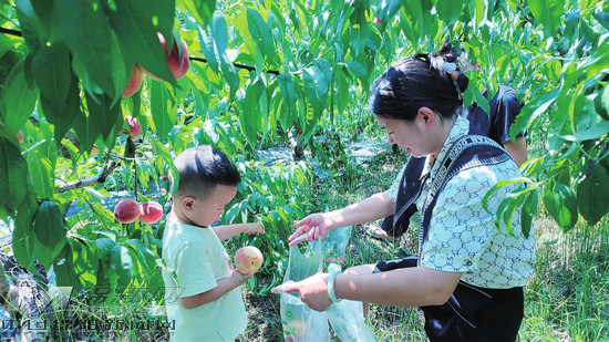 游客只需花399元,就能認養(yǎng)一棵專屬桃樹。不僅能收獲約30公斤成熟鮮桃,更能深度參與桃樹的成長——春天可以來為桃樹掛牌“認親”,并通過直播觀看疏果等田間管理過程,待到夏天親自采摘寫著自己名字的“豐收果”,帶孩子邊玩邊學,體驗比自然課生動十倍的田野課堂。