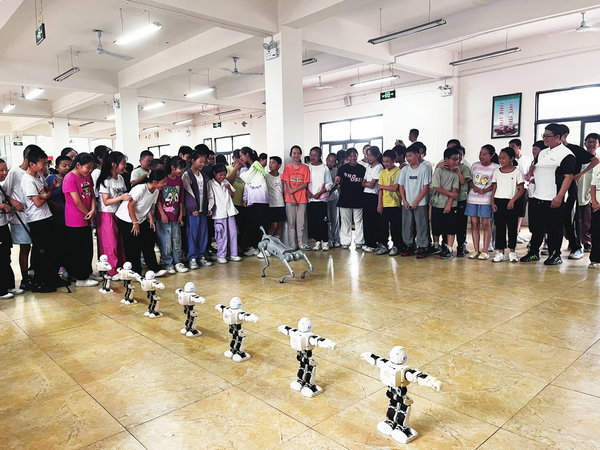 當(dāng)動(dòng)感的音樂響起,仿生機(jī)器人與機(jī)器狗閃亮登場(chǎng)。機(jī)器人跟著節(jié)奏靈活舞動(dòng),機(jī)器狗時(shí)而扭動(dòng)身軀、時(shí)而跳躍握手,甚至“慵懶”地伸起“腰”,萌態(tài)十足的表演引得孩子們爭(zhēng)相伸手互動(dòng),歡呼聲、驚嘆聲此起彼伏。“以前只在電視上看過機(jī)器人,今天能近距離接觸,太酷了!”學(xué)生陳鈺軒激動(dòng)地與同伴分享。