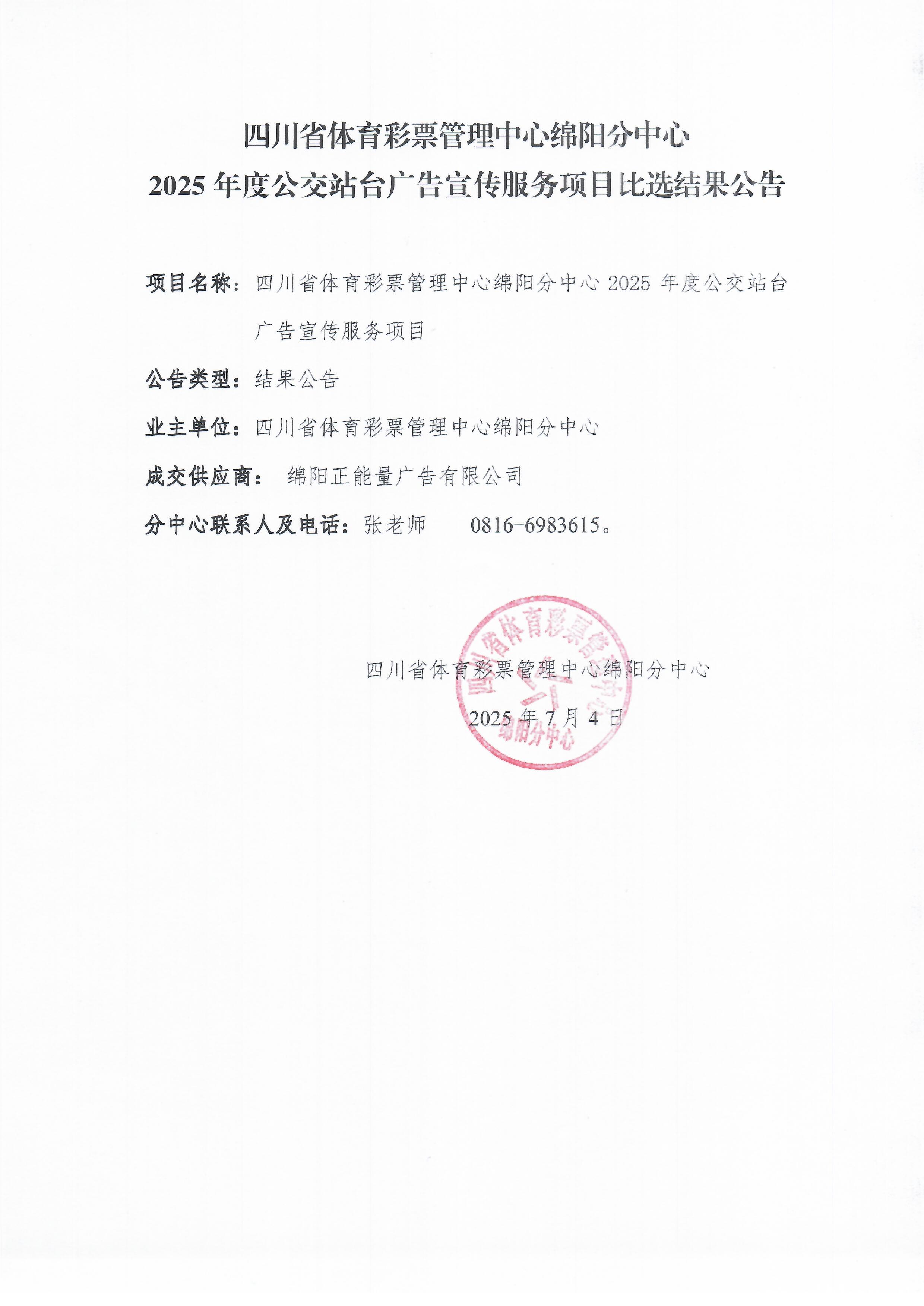 四川省體育彩票管理中心綿陽分中心2025年度公交站臺廣告宣傳服務(wù)項日比選結(jié)果公告
