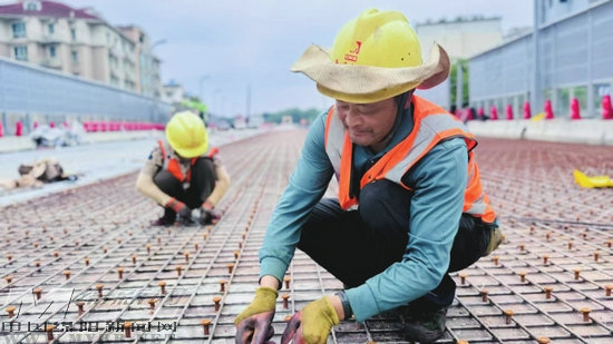 在三匯立交橋施工區(qū)現(xiàn)場,記者看到,橋下交通已恢復(fù),往來車輛依照地面交通標(biāo)線和信號(hào)燈有序通行。新的三匯立交橋主體已完工,工人們正在橋面進(jìn)行鋼筋綁扎、混凝土鋪設(shè)作業(yè)。