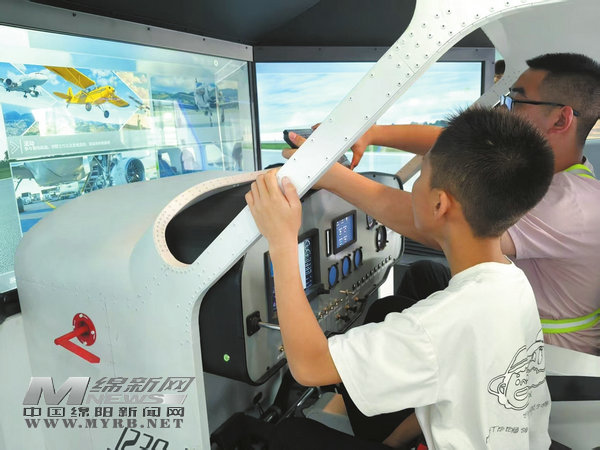 孩子們在北川永昌機場體驗全真模擬飛行器