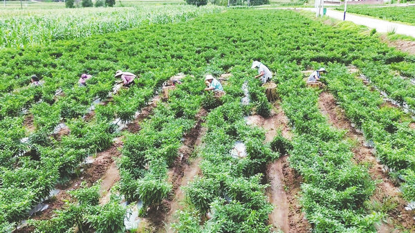 在飛鳳村新建的收購(gòu)點(diǎn),滿載辣椒的貨車整裝待發(fā)。村民李大姐笑著說:“土地流轉(zhuǎn)金加工錢,一年能掙兩萬多元,顧家賺錢兩不誤。”