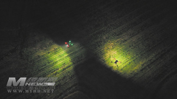 無(wú)人機(jī)夜間在玉米地進(jìn)行農(nóng)藥噴灑作業(yè)