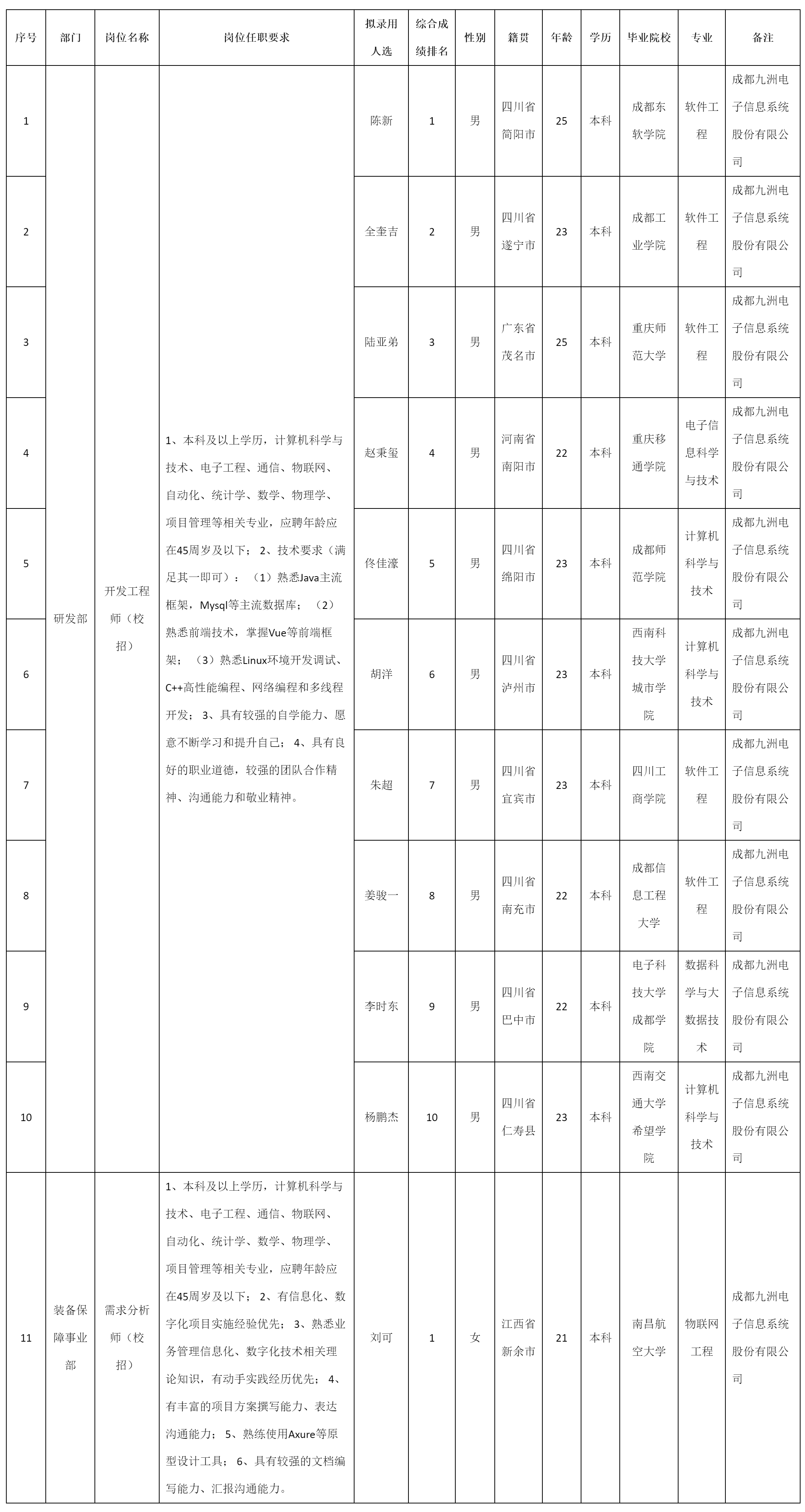 根據(jù)四川九洲投資控股集團(tuán)有限公司軟件與數(shù)據(jù)智能軍團(tuán)發(fā)布的招聘公告及招聘相關(guān)規(guī)定,經(jīng)筆試、面試、考察、體檢等程序,擬錄用陳新等11名同志到四川九洲投資控股集團(tuán)有限公司軟件與數(shù)據(jù)智能軍團(tuán)工作,現(xiàn)予以公示,具體情況如下: